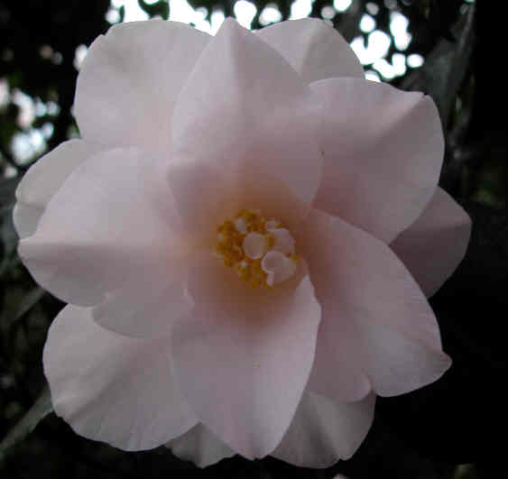 Zartrosa, später perlmuttweiße halbgefüllte, etagenförmig ineinander gesteckte Blüten, langsamer Wuchs