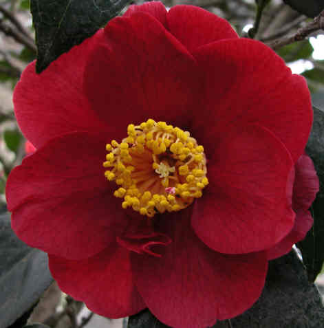 dunkelrote, halbgefüllte Blüten, die durch ein geordnetes Büschel tiefgelber