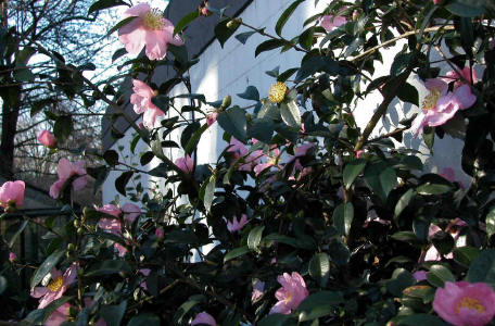 C. sasanqua In unseren Breiten weniger bekannt ist die Camellia sasanqua. Dieser Kamelienart werden nicht nur die C. sasanqua mit ihren Varietäten zugerechnet, sondern auch Kamelien, die unter den Namen C. hiemalis und C. vernalis geführt werden. Letztere werden auch als Hybriben von C. sasanqua mit C. japonica angesehen. Die Sasanquakamelien blühen im Herbst und Winter, wachsen schneller als die C. japonica und sind daher in der Anschaffung eher preiswerter als langsam wachsende Kamelienarten. Die Sasanqua besitzt kleine spitz zulaufende Blätter, ihr Wuchs ist zierlicher und kompakter als der der C. japonica. Ursprünglich stammt die Sasanqua aus der Inselwelt des südlichen Japan, sie verträgt Sonne und ist relativ winterhart. Ihre Blüten sind einfach bis halbgefüllt, die Blütenblätter weiß zum Blütenrand hin oft zartrosa. Der Blütendurchmesser beträgt bis zu 8 cm. Viele Sorten haben rosa Blüten , auffällig sind Büschel goldgelber, üppiger Staubgefäße. Fast alle Sasanquakamelien zeichnen sich besonders gegen Abend durch einen intensiven erdigen Duft aus. Aus ihren Blättern wurde im 17. und 18. Jahrhundert in Japan ein einfacher Tee und aus den Früchten ein Öl zur Haarkosmetik hergestellt. Bis Anfang des 19. Jahrhundert geriet sie etwas in Vergessenheit. Erst in der zweiten Jahrhunderthälfte kamen die ersten Pflanzen nach Europa, sie spielten hier nie eine solche Rolle wie die C. japonica. Nur in Italien erfuhr die Sasanqua eine gewisse Wertschätzung, deshalb stammen auch heute noch die meisten in Deutschland verkauften Sasanquakamelien aus Oberitalien. Im Gegensatz zu Europa erfreut sich die Sasanqua in Australien, Neuseeland und USA hoher Beliebtheit. Sie spielt in der Hybridenzüchtung eine zunehmend wichtige Rolle, da sie gegen Wurzelerkrankungen weniger anfällig zu sein scheint. Sie wächst schnell und eignet sich daher auch zur Anlage einer immergrünen, im Herbst wunderschön blühenden Hecke.