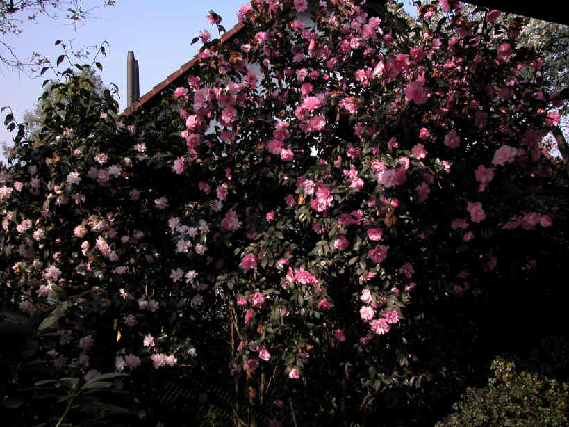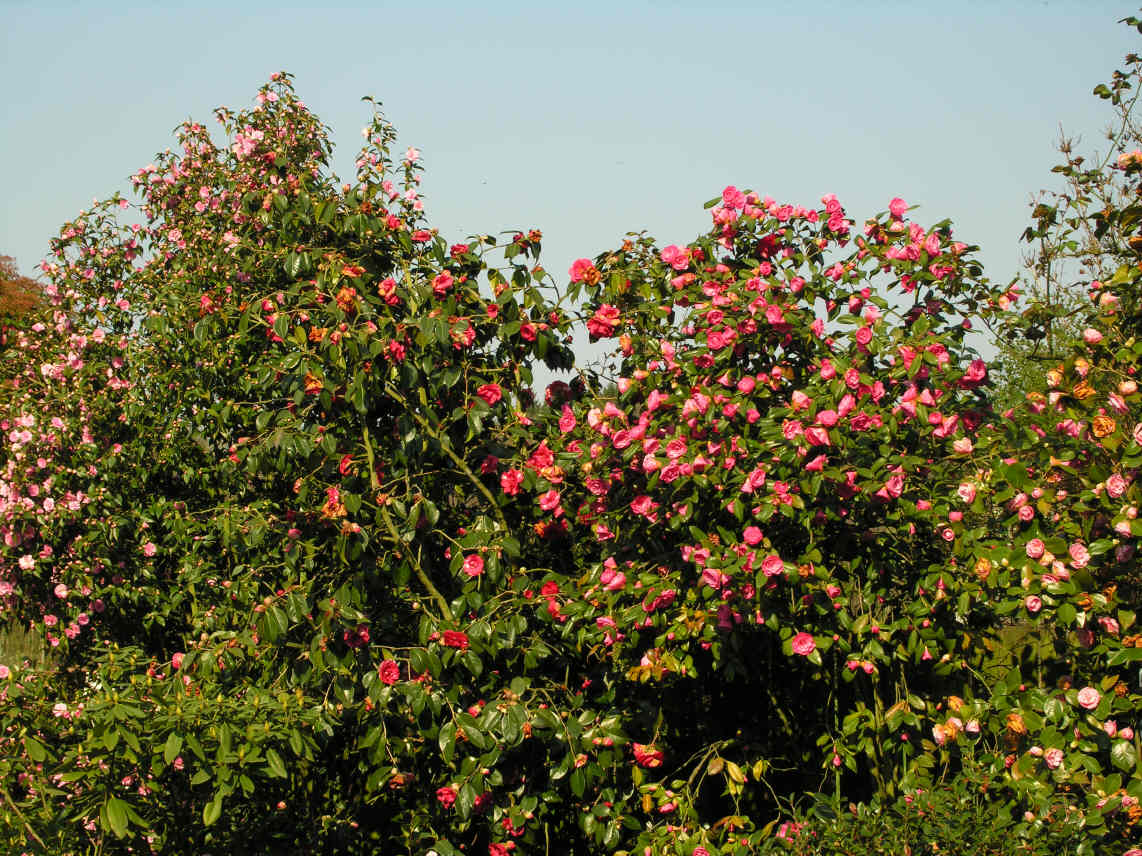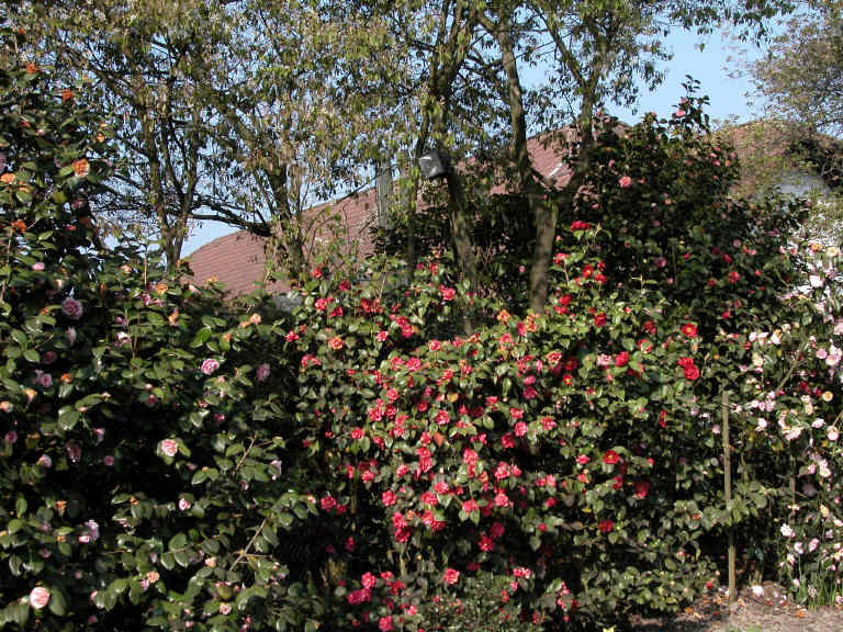 Blühende Kameliensträucher im April 2007, von links nach