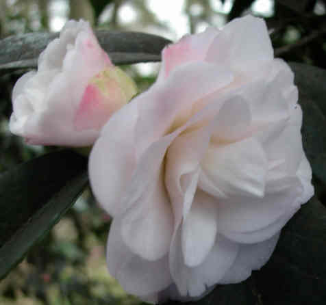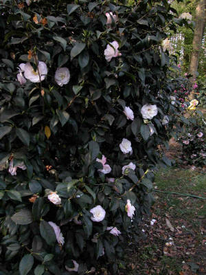 Die großen schweren Blüten dieser Kamelie ziehen die